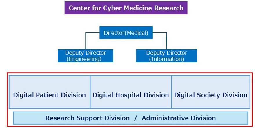 In order to solve issues in the field of medical healthcare, it is important to understand and control the “Diversity and Dynamics of Medical Information,” in which the occurrence of diseases and health conditions are dynamically changing along the time axis from healthy to unwell, and from early to late stage of disease, by understanding the diversity of genomic, lifestyle and environmental factors, and the uncertainty of medical information. Therefore, in April 2024, the Cyber Medicine Research Center was established with a focus on clinical medicine, with cutting-edge experts in informatics, engineering, life sciences, and social medicine collaborating in an “under-one-roof” approach to solving problems. The Cyber Medicine Research Center has established three research divisions, Digital Patient, Digital Hospital, and Digital Society, as well as a Medical AI R&D division. The center aims to be the first medical DX research center in Japan that integrates advanced science and technology in medicine, informatics, and engineering to promote a wide range of medical device development and drug discovery research from the stage of pre-disease to hospitals and nursing care, utilizing a cyclical data linkage system of medicine, food, and the environment created in cooperation with local governments and communities. We will continue our efforts to achieve results and accomplishments, and to implement issues in the medical field into society through a comprehensive system of integrated research in the fields of medicine, informatics, and engineering.